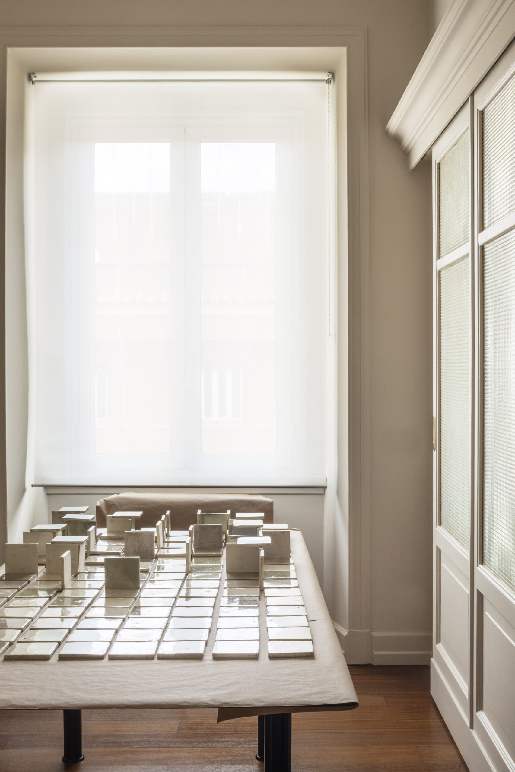 Il rivestimento definisce la superficie esterna, elemento di protezione e resistenza. Costituito da materiali solidi, impermeabili e geometricamente strutturati, si colloca tra funzione ed espressione formale. La sua presenza oscilla tra necessità tecnica e ricerca progettuale, dal rivestimento degli ambienti domestici – bagni, cucine – alla costruzione di sistemi di difesa contro l’acqua e gli agenti atmosferici. Le piastrelle in ceramica smaltata, realizzate a mano dagli artigiani di Ravasini, si ricompongono su un piano e si aggregano in forme, come fossero minuscoli ambienti.