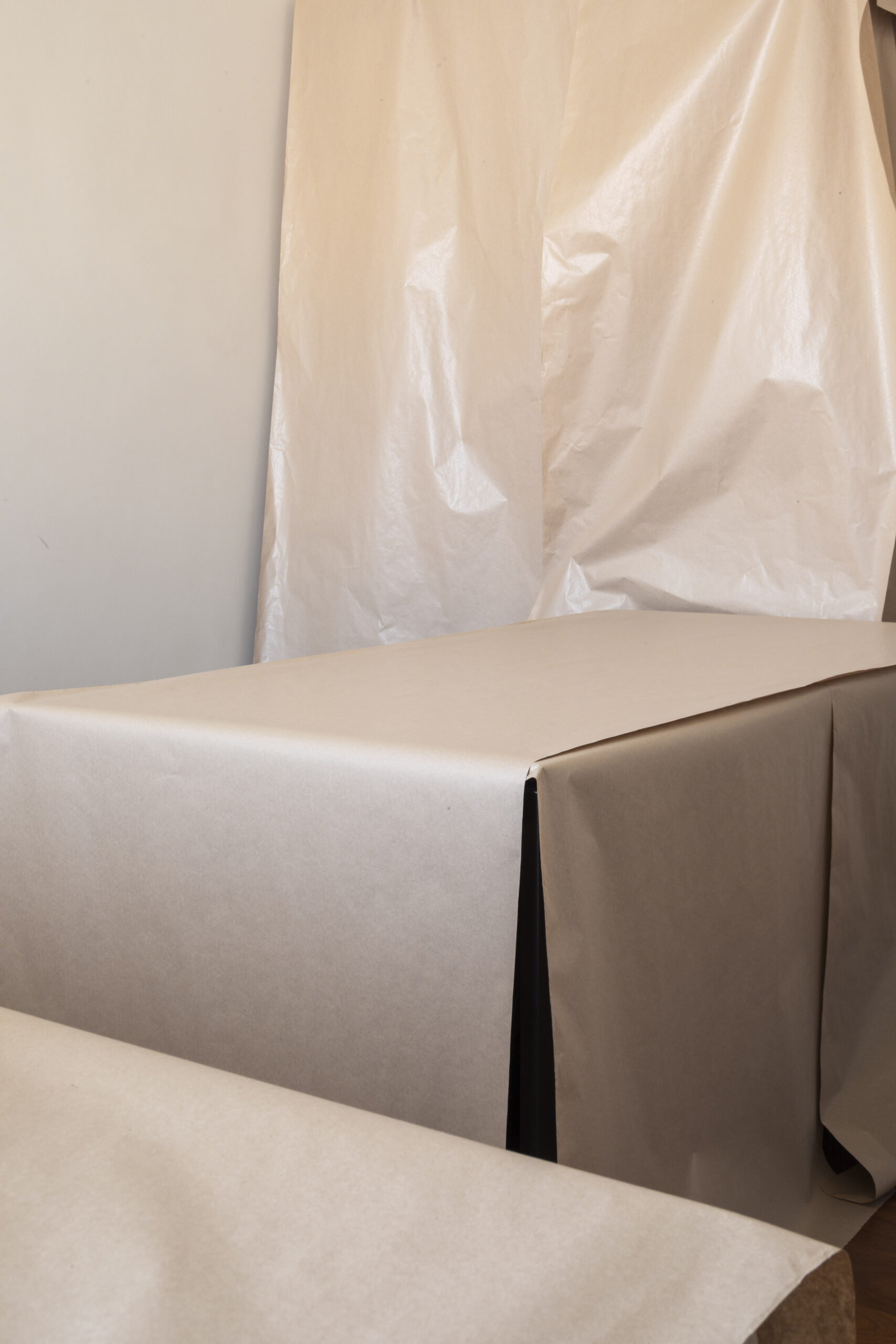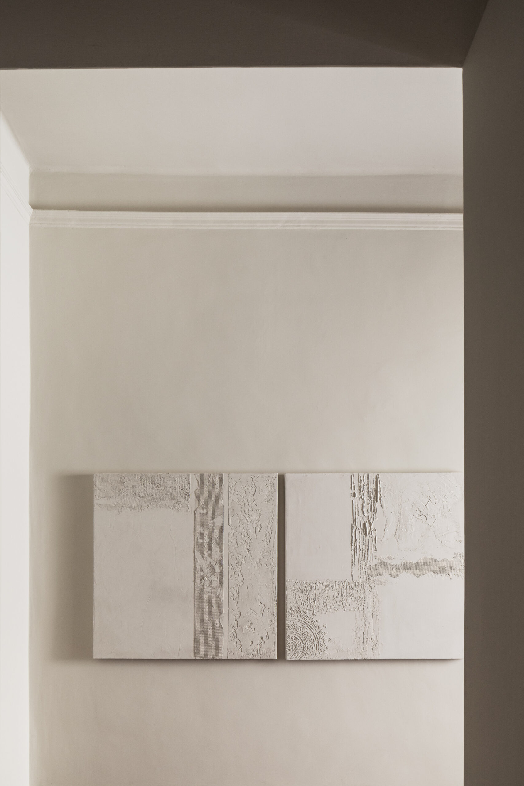 La superficie è la pelle dello spazio, elemento di delimitazione e struttura percettiva. La sua qualità non è solo visiva, ma anche tattile: un supporto attraversato dal segno, capace di articolare il ritmo e la scansione dell’ambiente. Trattata come materia e non solo come piano bidimensionale, la superficie diviene un elemento attivo, caratterizzato da imperfezioni, variazioni cromatiche e trasformazioni. I pannelli in argilla naturale di Matteo Brioni mostrano tutte le variazioni possibili attraverso diversi gradi di finitura e grana: una pelle che si increspa e si distende.